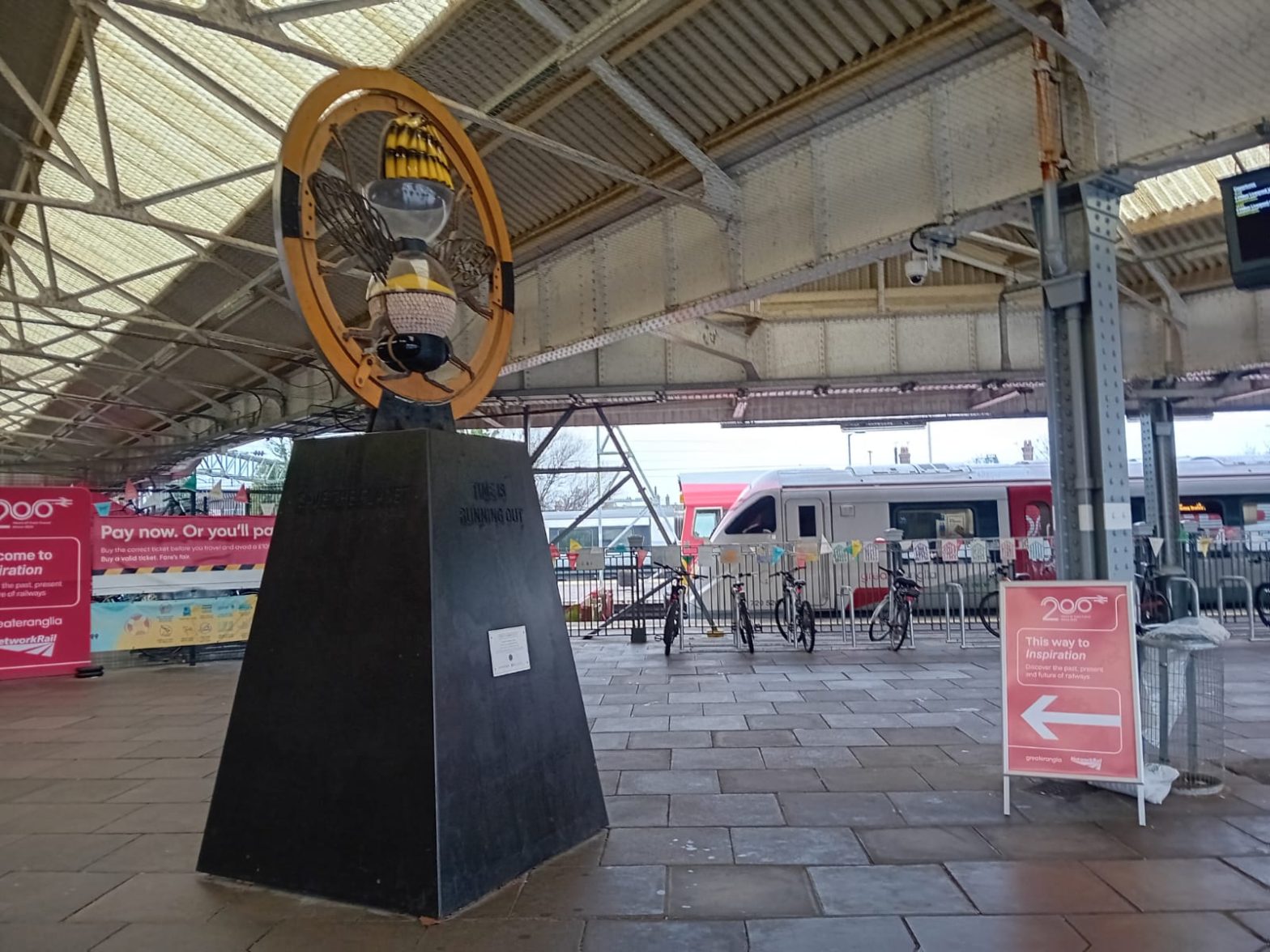 When we installed our ‘Time is Running Out’ sculpture at Clacton-on-Sea in Essex, we never thought that one day it would be welcoming the Rail 200 Inspiration Train! Yet it seems quite fitting. When student Madeleine Higgs designed her hourglass sculpture, her message was clear – time is running out to save the bees. As …